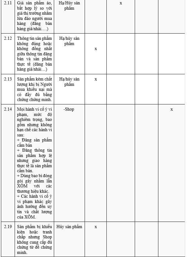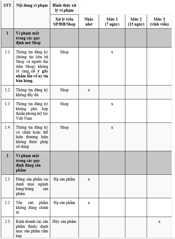 + Vi phạm bản quyền: là hành vi sử dụng trái phép nội dung được bảo vệ bản quyền, chẳng hạn như hình ảnh và mô tả liên quan đến sản phẩm hoặc bao bì/nội dung đăng bán của sản phẩm.